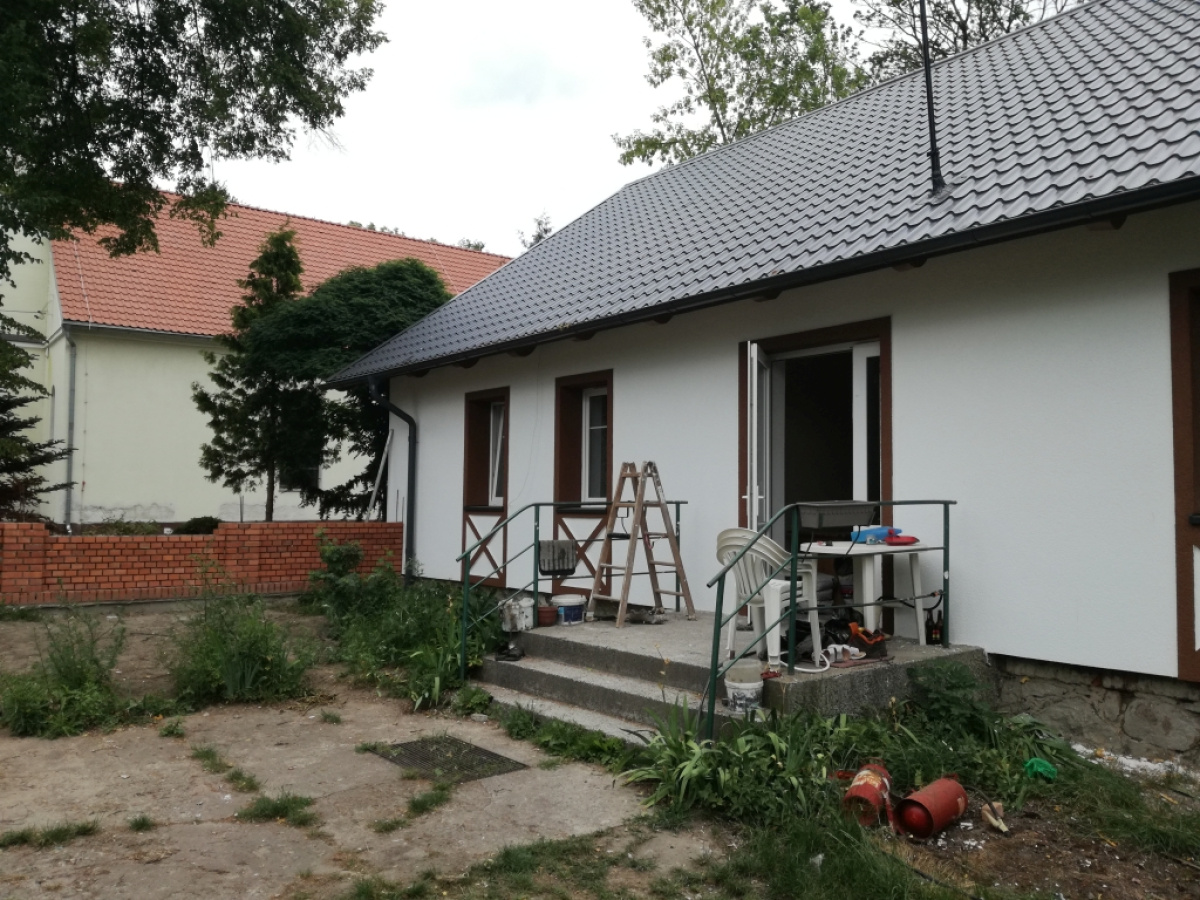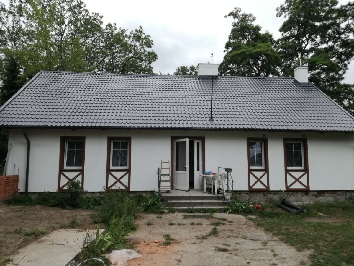 W miejscowości Giemlice trwają prace związane z termomodernizacją budynku komunalnego. Efekty widoczne są gołym okiem. Nie tylko poprawi się efektywność energetyczna, ale też estetyka remontowanego budynku. Z uwagi na bardzo zły stan techniczny oraz duże zawilgocenia, wg ekspertyzy technicznej elewacja musiała zostać całkowicie wyremontowana oraz izolowana styropianem. W ramach inwestycji wymieniony został w całości dach, który pokryty był eternitem, materiałem szkodliwym dla zdrowia mieszkańców zamieszkujących ten obiekt.