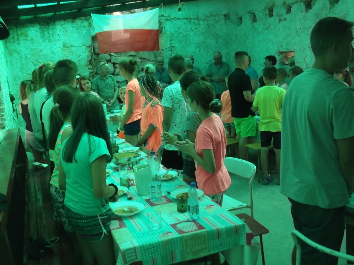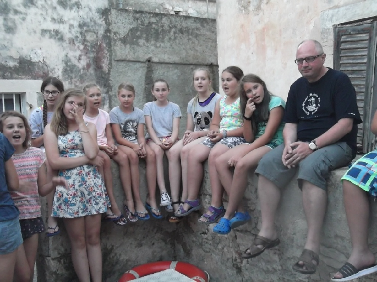 Po zapoznaniu się z ośrodkiem i pierwszym wspólnym obiedzie nadszedł czas na pierwszą kąpiel w Morzu Adriatyckim. Po kolacji oraz krótkim odpoczynku, odbyło się spotkanie informacyjne z Panią Hanną Stanecką - komendantem obozu. Zapoznaliśmy się z obowiązującymi zasadami i wyjaśniliśmy wszystkie wątpliwości. Następnie uczestnicy zostali podzieleni na 5 wacht po 5 osób. Każda wachta danego dnia i o danej porze będzie pełniła dyżur w postaci pomocy przy: przygotowywaniu posiłków, sprzątaniu ośrodka oraz odprawianiu mszy świętej w tutejszym kościele. Ponadto obozowicze zaśpiewali oraz przygotowali słodką niespodziankę dla jednego z uczestników - Mateusza Klimka, który tego dnia obchodził swoje urodziny.