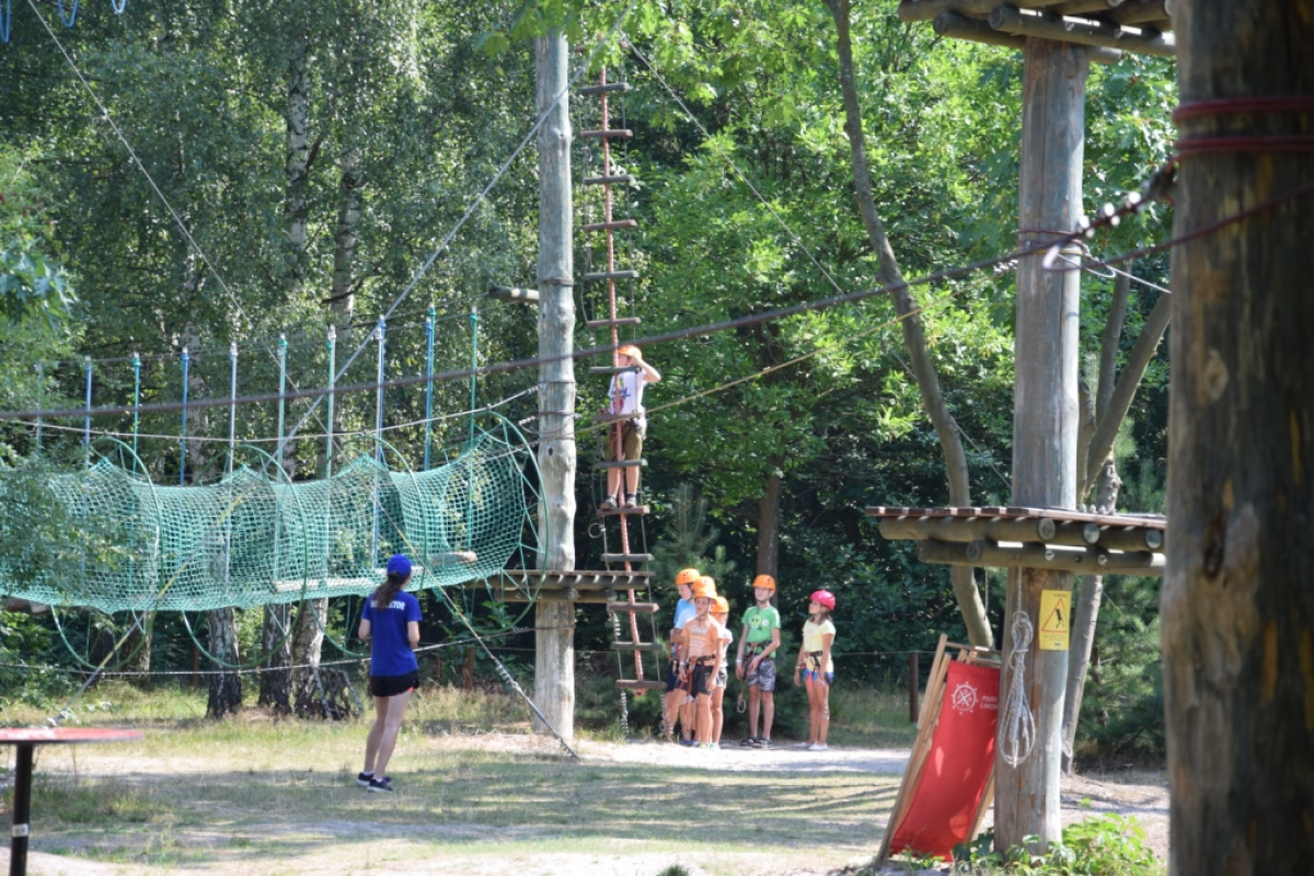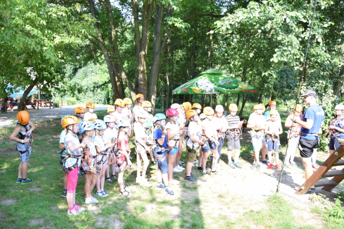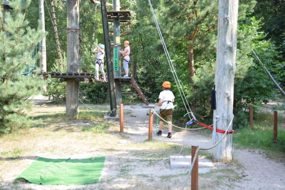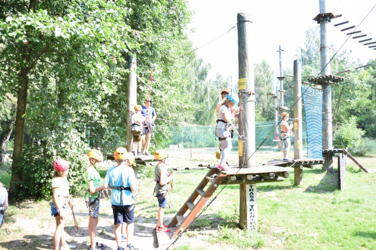 Po dotarciu na miejsce grupa dzieci została ubrana w niezbędny sprzęt alpinistyczny oraz kaski ochronne dzięki, którym mogli bezpiecznie korzystać z atrakcji jakie na nich czekały. Przed wejściem na trasę zieloną, pomarańczową lub czerwoną parku linowego, każdy uczestnik musiał przejść obowiązkowe szkolenie na odcinku treningowym, podczas którego zapoznał się z zasadami posługiwania się sprzętem asekuracyjnym. Dopiero po prawidłowym pokonaniu trasy szkoleniowej zostali dopuszczeni do wejścia na pełne trasy parku linowego.