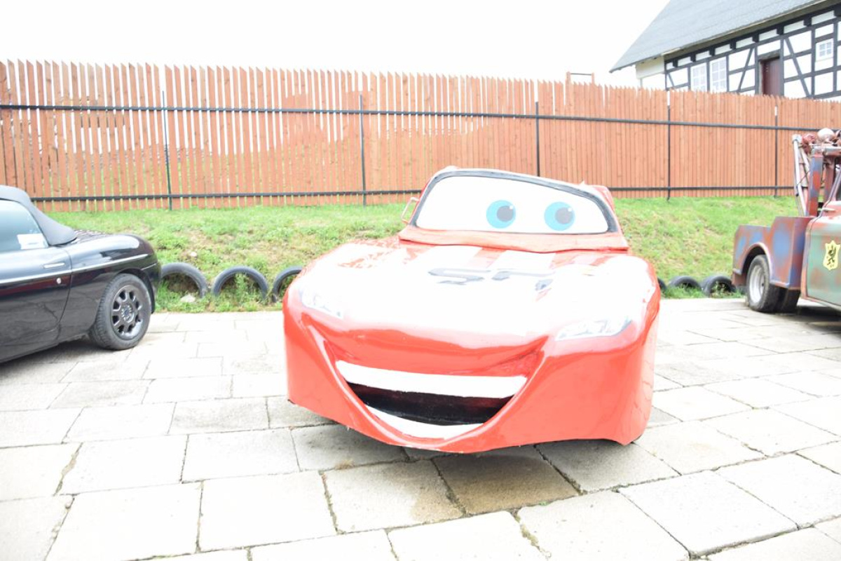 Z Kaszubskiego Parku Miniatur udaliśmy się do położonego obok Parku Gigantów. By do niego dotrzeć trzeba pokonać ok. 700 metrową piaszczystą drogę pod górkę, którą my przejechaliśmy kolejką. W ramach urozmaicenia przy drodze witały nas ustawione figurki zwierząt domowych, tj.: krowy, kozy, świnie, gęsi, kury, koń, osiołek, owce.