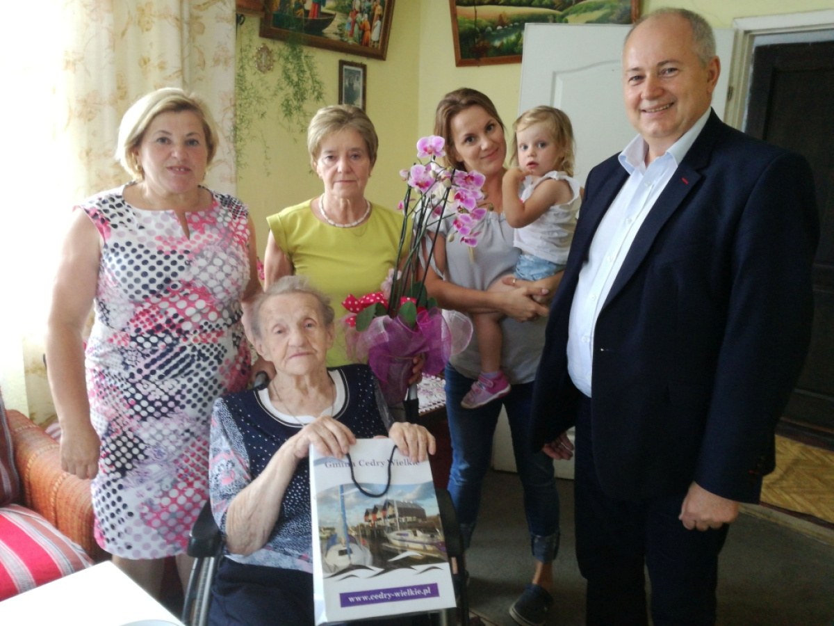 W dniu 22.08.2018 r. Pani Helena Lis zamieszkała w Cedrach Małych obchodziła 92 rocznicę urodzin. Delegacja w osobie Wójta Gminy Cedry Wielkie Pana Janusza Golińskiego oraz pracownika socjalnego Gminnego Ośrodka Pomocy Społecznej w Cedrach Wielkich Pani Marii Wawer udała się do Jubilatki z bukietem kwiatów oraz okolicznościowym upominkiem, składając życzenia w imieniu własnym oraz mieszkańców.