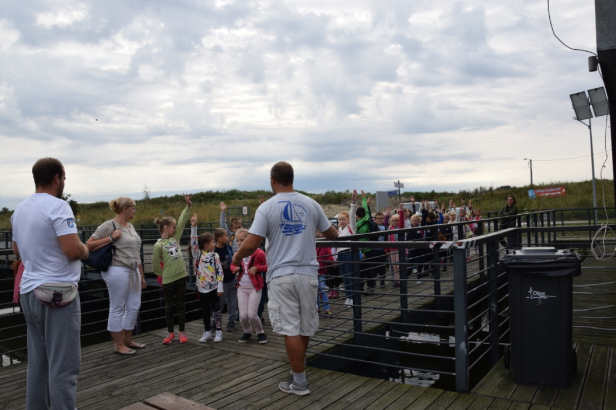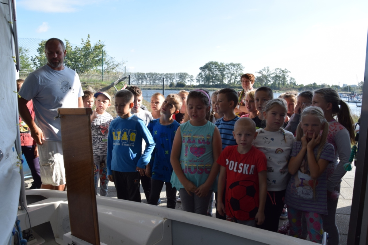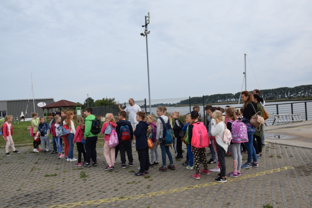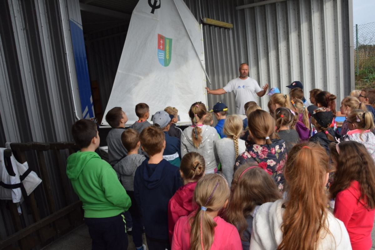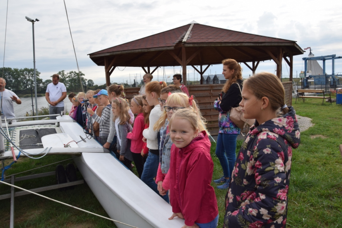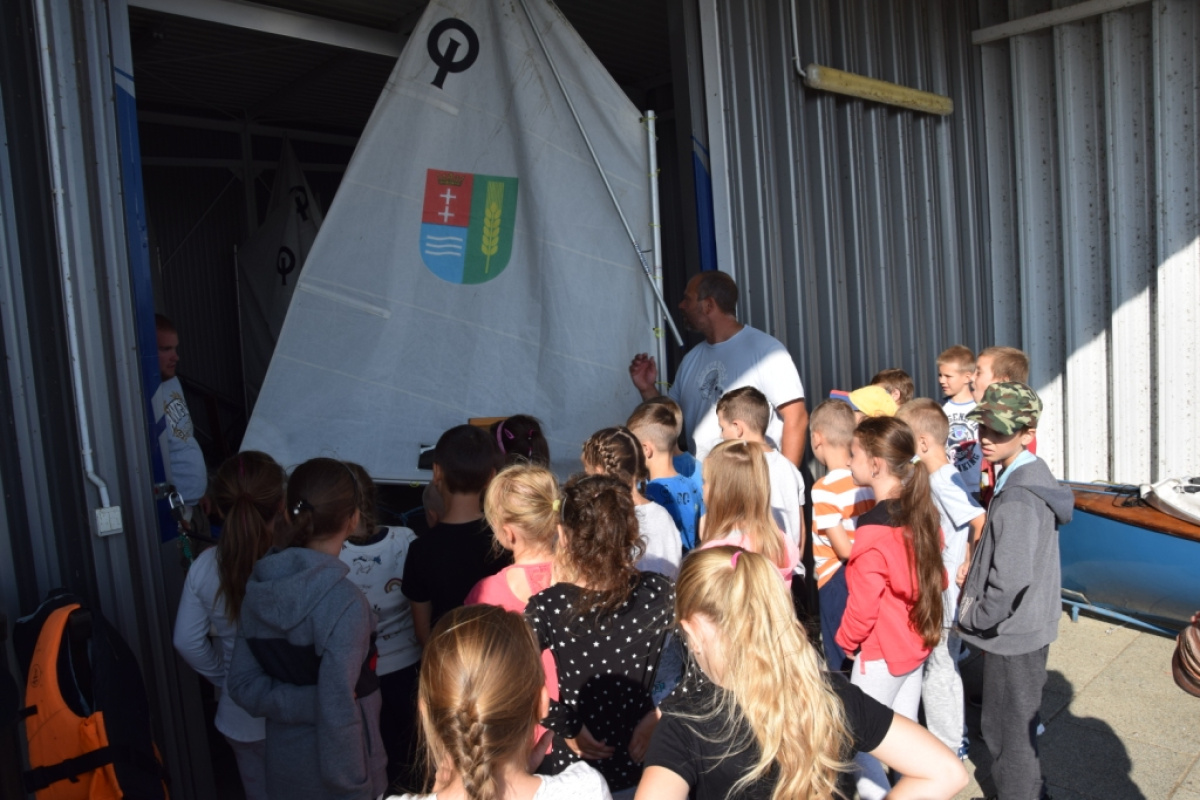 Podczas wspólnych oględzin, trener opowiadał dzieciom o przystani i szkółce, wprowadzając uczestników w tajniki ich funkcjonowania, nie zapominając przy tym o tematycznych ciekawostkach. Kolejnym krokiem ku zgłębieniu wiedzy żeglarskiej, było obejrzenia filmu, przedstawiającego sposoby żeglowania oraz prawidłowe zachowanie na wodzie i w wodzie, uwzględniając występujące przy tym niebezpieczeństwa. Po tak solidnym wprowadzeniu i nałożeniu kamizelek ratunkowych, uczniowie udali się do połączonych ze sobą sznurem łodzi klasy OPTYMIST, na których pływali po 4 osoby. W ramach oswojenia się z wodą, dzieci pod okiem trenera wykonywały na łodziach lekkie ćwiczenia fizyczne. Zakończywszy zajęcia teoretyczne oraz praktyczne, uczestnicy w grupach zwiedzili akwen z Panem Krzysztofem motorówką.