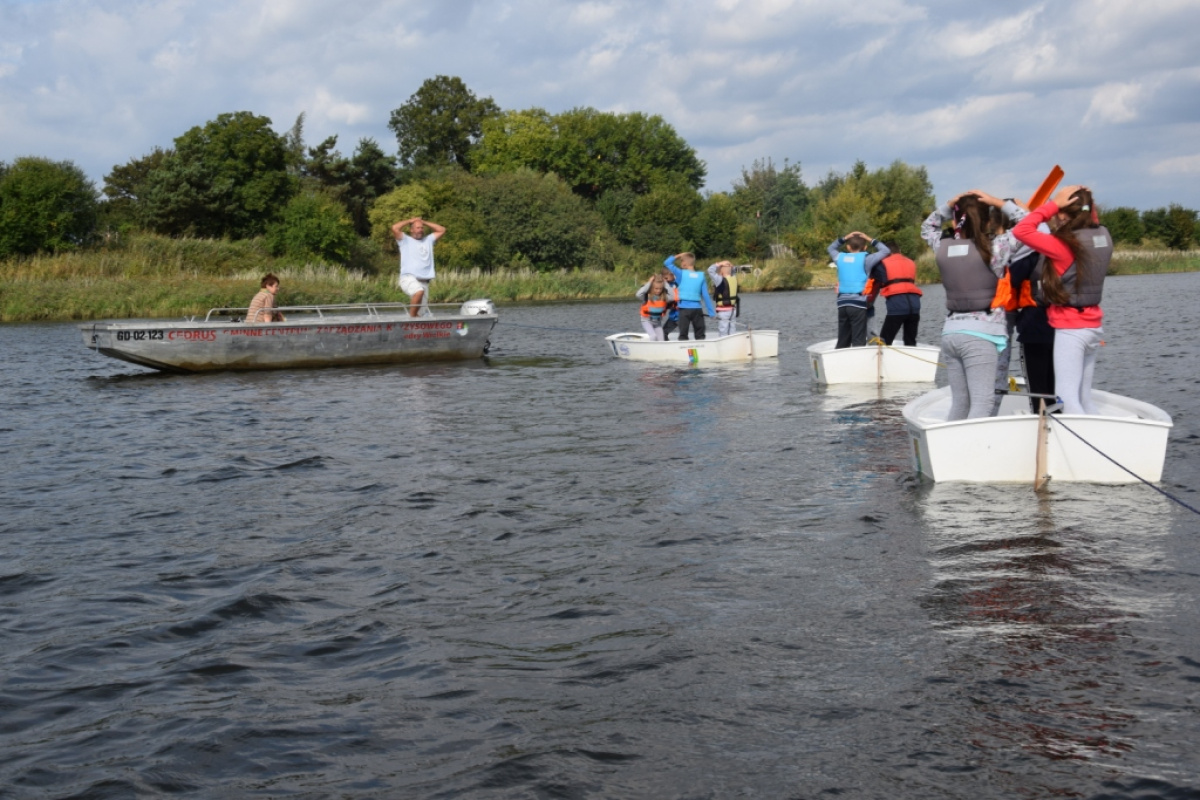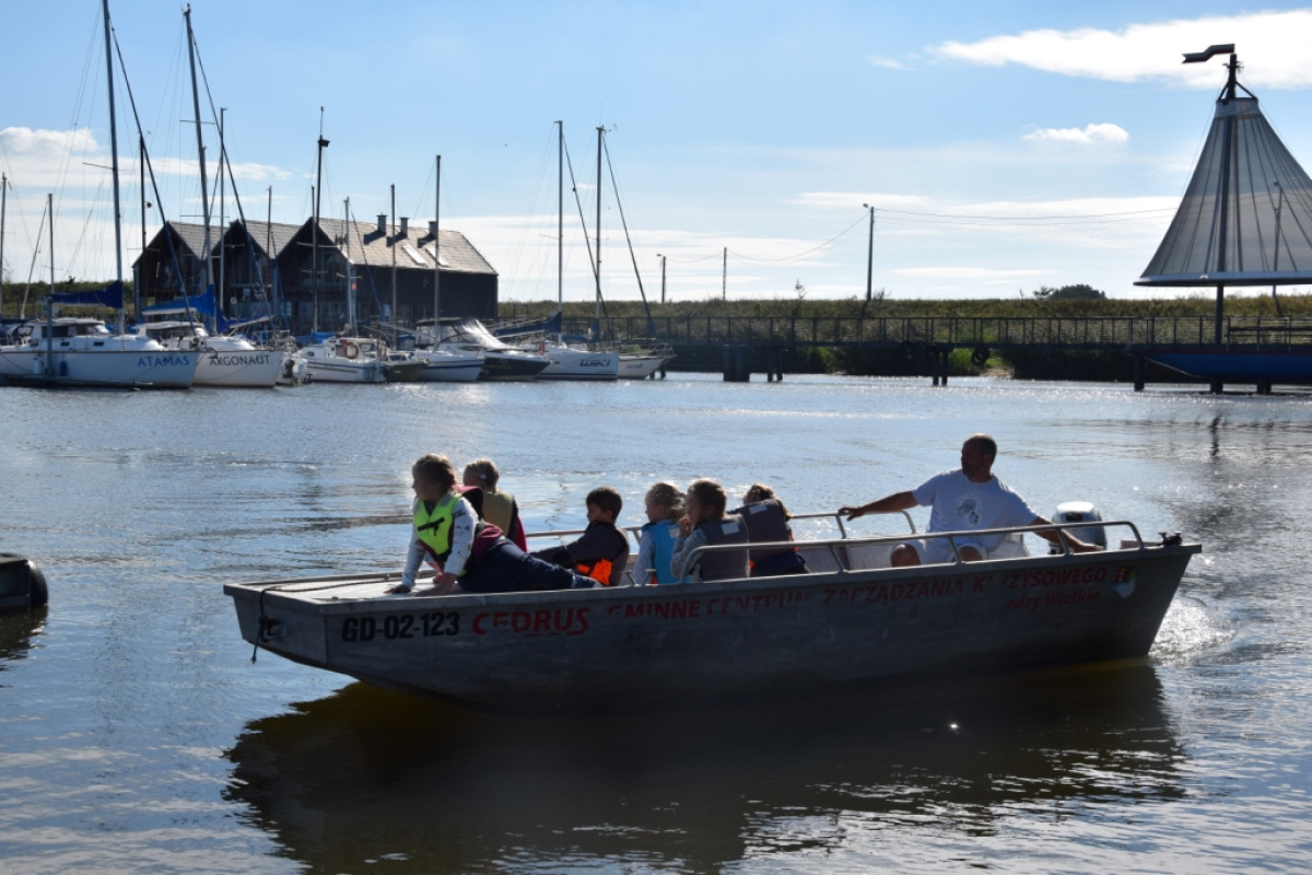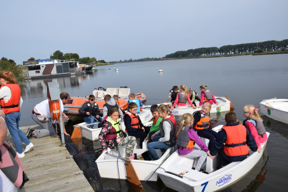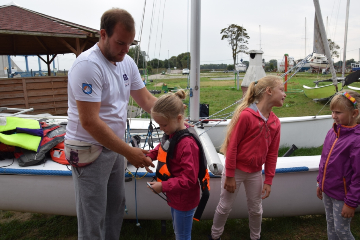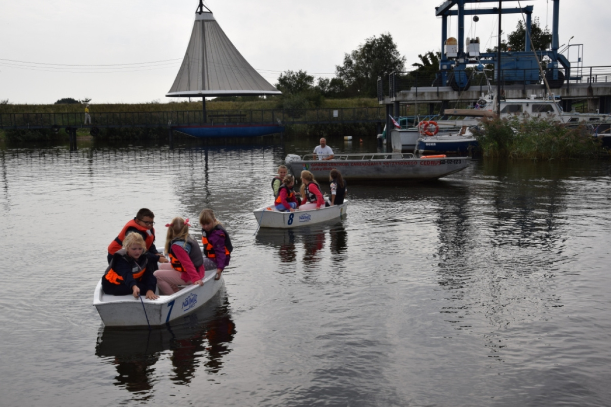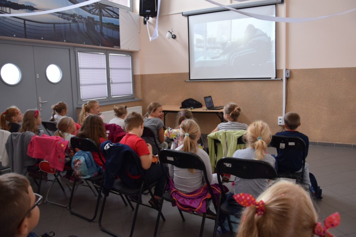 Podczas wspólnych oględzin, trener opowiadał dzieciom o przystani i szkółce, wprowadzając uczestników w tajniki ich funkcjonowania, nie zapominając przy tym o tematycznych ciekawostkach. Kolejnym krokiem ku zgłębieniu wiedzy żeglarskiej, było obejrzenia filmu, przedstawiającego sposoby żeglowania oraz prawidłowe zachowanie na wodzie i w wodzie, uwzględniając występujące przy tym niebezpieczeństwa. Po tak solidnym wprowadzeniu i nałożeniu kamizelek ratunkowych, uczniowie udali się do połączonych ze sobą sznurem łodzi klasy OPTYMIST, na których pływali po 4 osoby. W ramach oswojenia się z wodą, dzieci pod okiem trenera wykonywały na łodziach lekkie ćwiczenia fizyczne. Zakończywszy zajęcia teoretyczne oraz praktyczne, uczestnicy w grupach zwiedzili akwen z Panem Krzysztofem motorówką.
