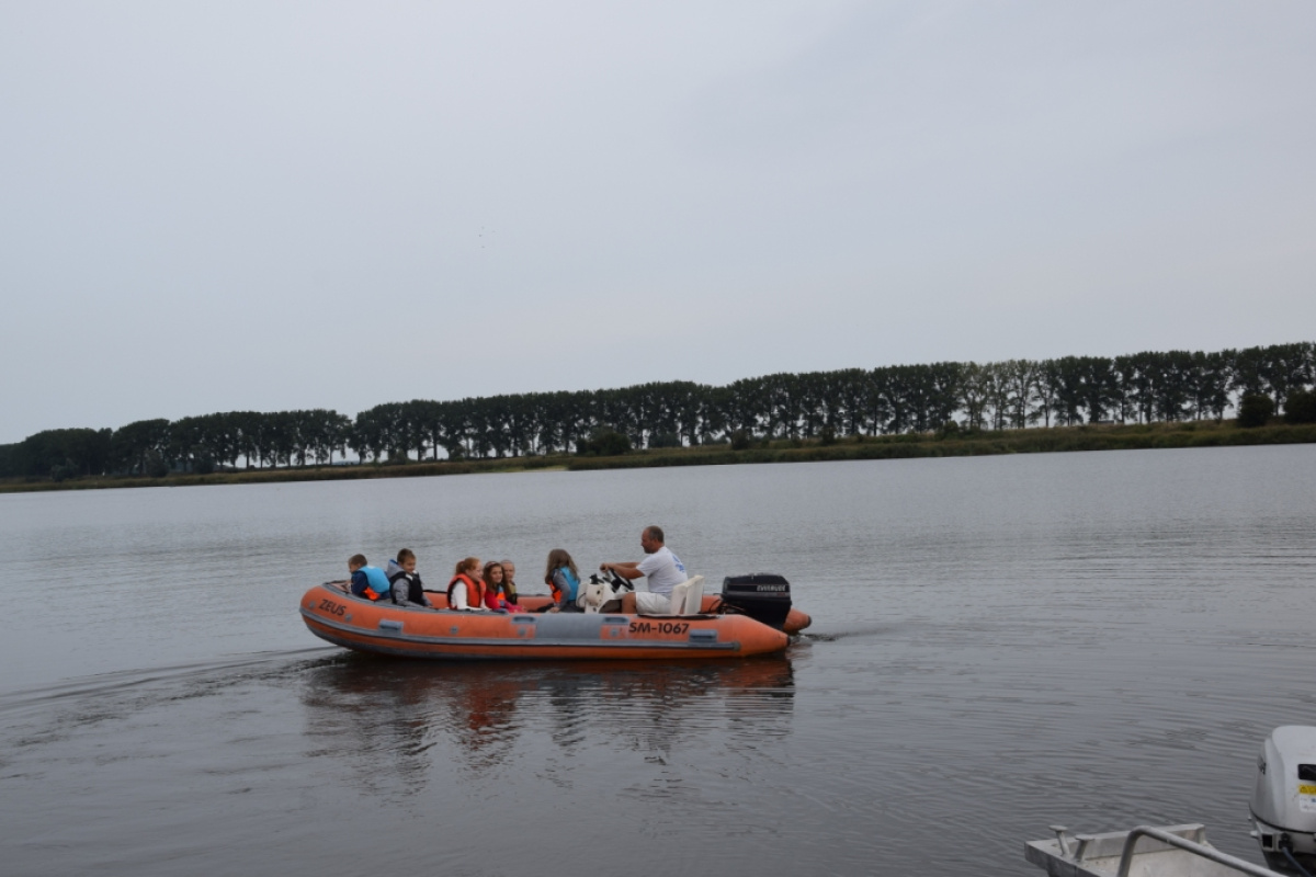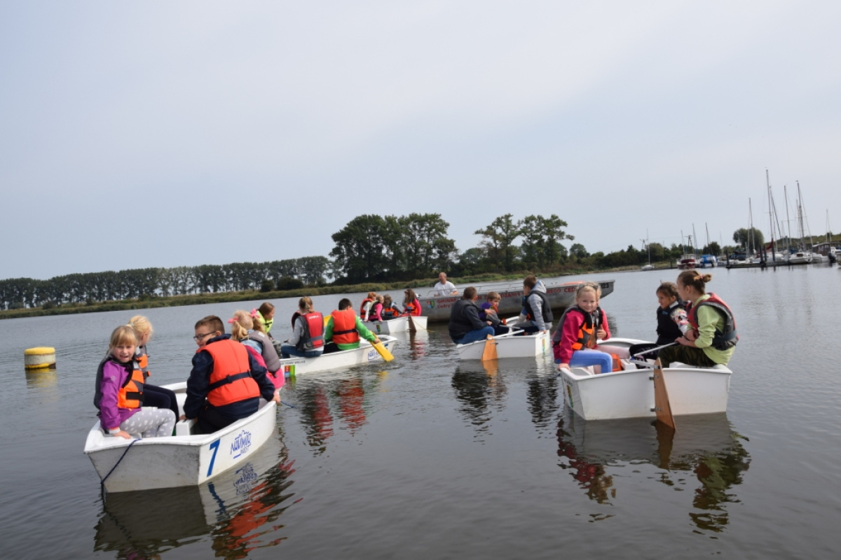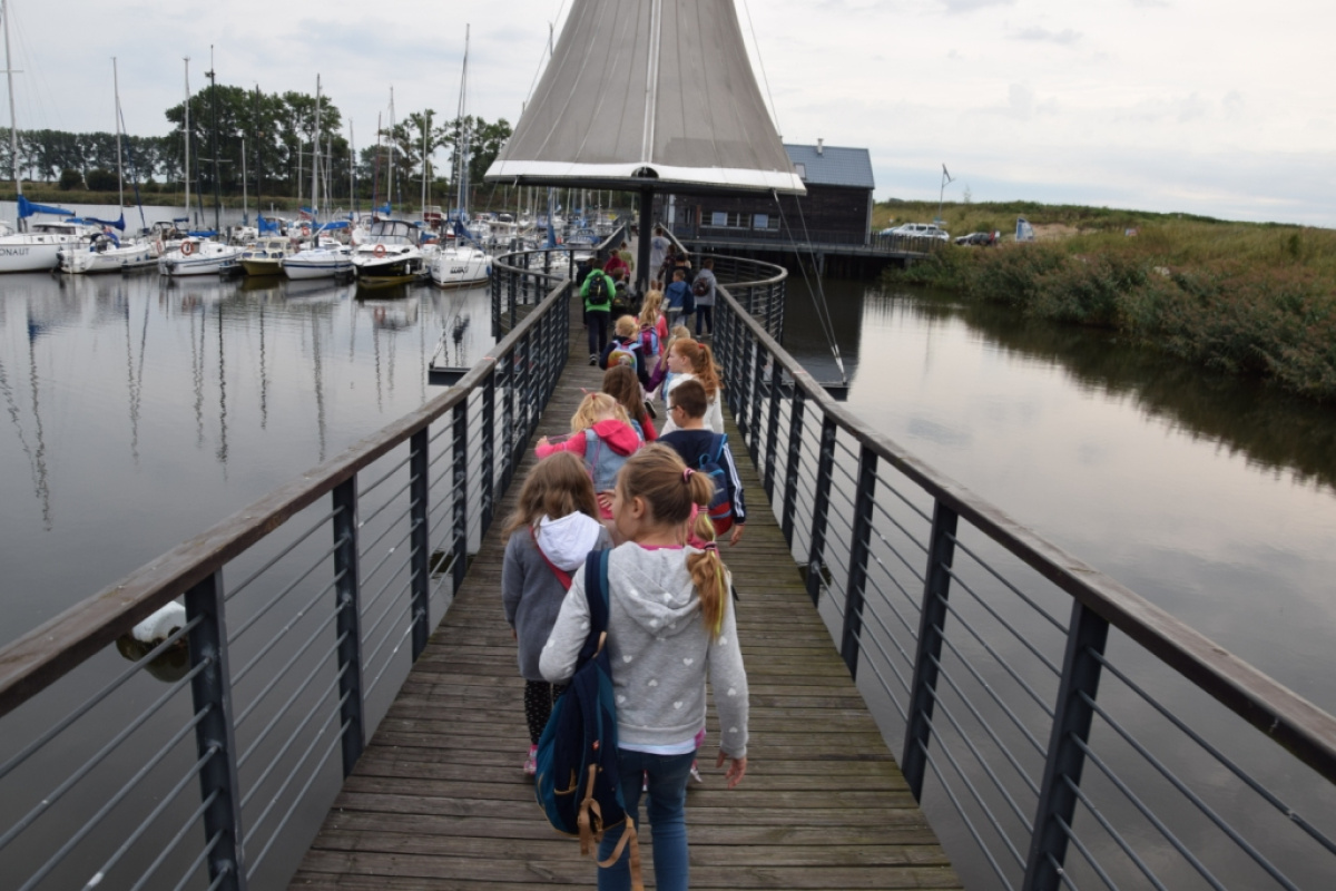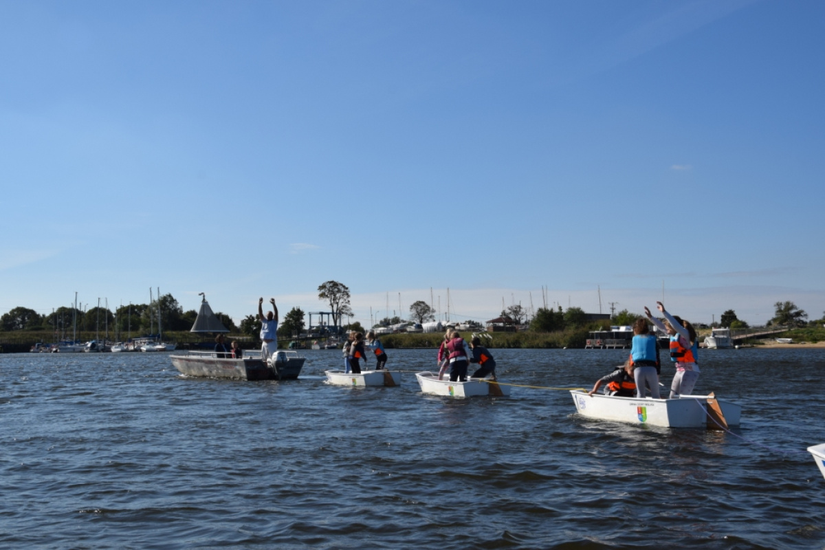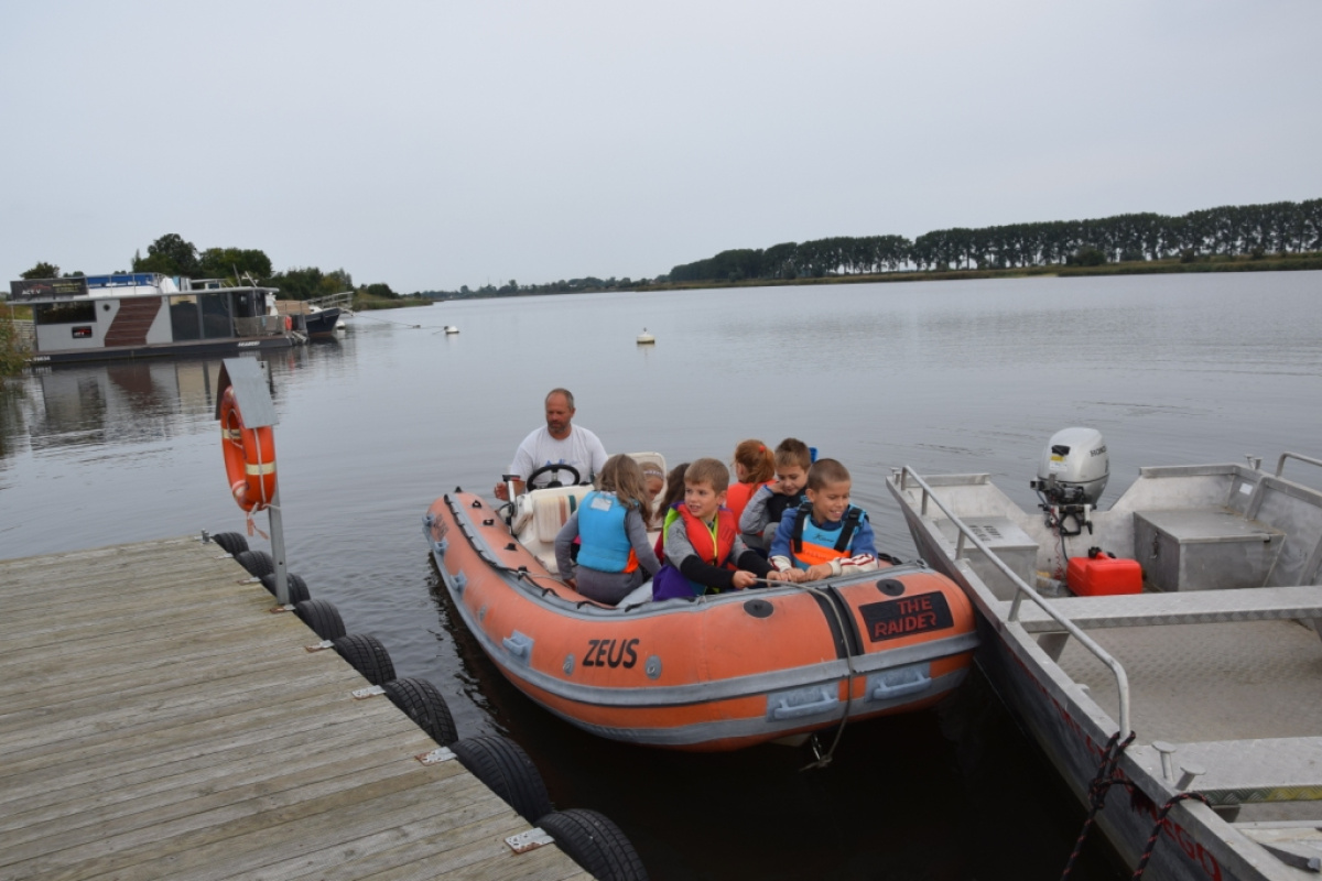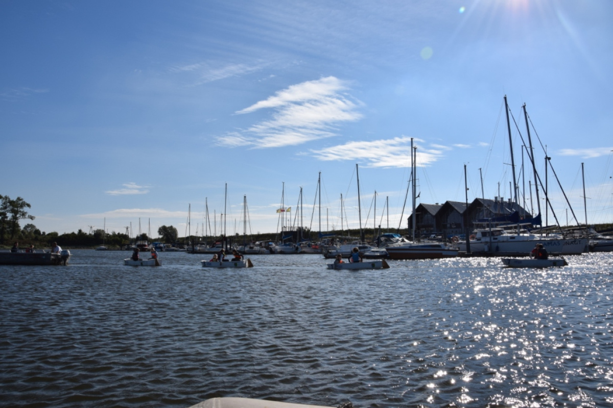 Podczas wspólnych oględzin, trener opowiadał dzieciom o przystani i szkółce, wprowadzając uczestników w tajniki ich funkcjonowania, nie zapominając przy tym o tematycznych ciekawostkach. Kolejnym krokiem ku zgłębieniu wiedzy żeglarskiej, było obejrzenia filmu, przedstawiającego sposoby żeglowania oraz prawidłowe zachowanie na wodzie i w wodzie, uwzględniając występujące przy tym niebezpieczeństwa. Po tak solidnym wprowadzeniu i nałożeniu kamizelek ratunkowych, uczniowie udali się do połączonych ze sobą sznurem łodzi klasy OPTYMIST, na których pływali po 4 osoby. W ramach oswojenia się z wodą, dzieci pod okiem trenera wykonywały na łodziach lekkie ćwiczenia fizyczne. Zakończywszy zajęcia teoretyczne oraz praktyczne, uczestnicy w grupach zwiedzili akwen z Panem Krzysztofem motorówką.