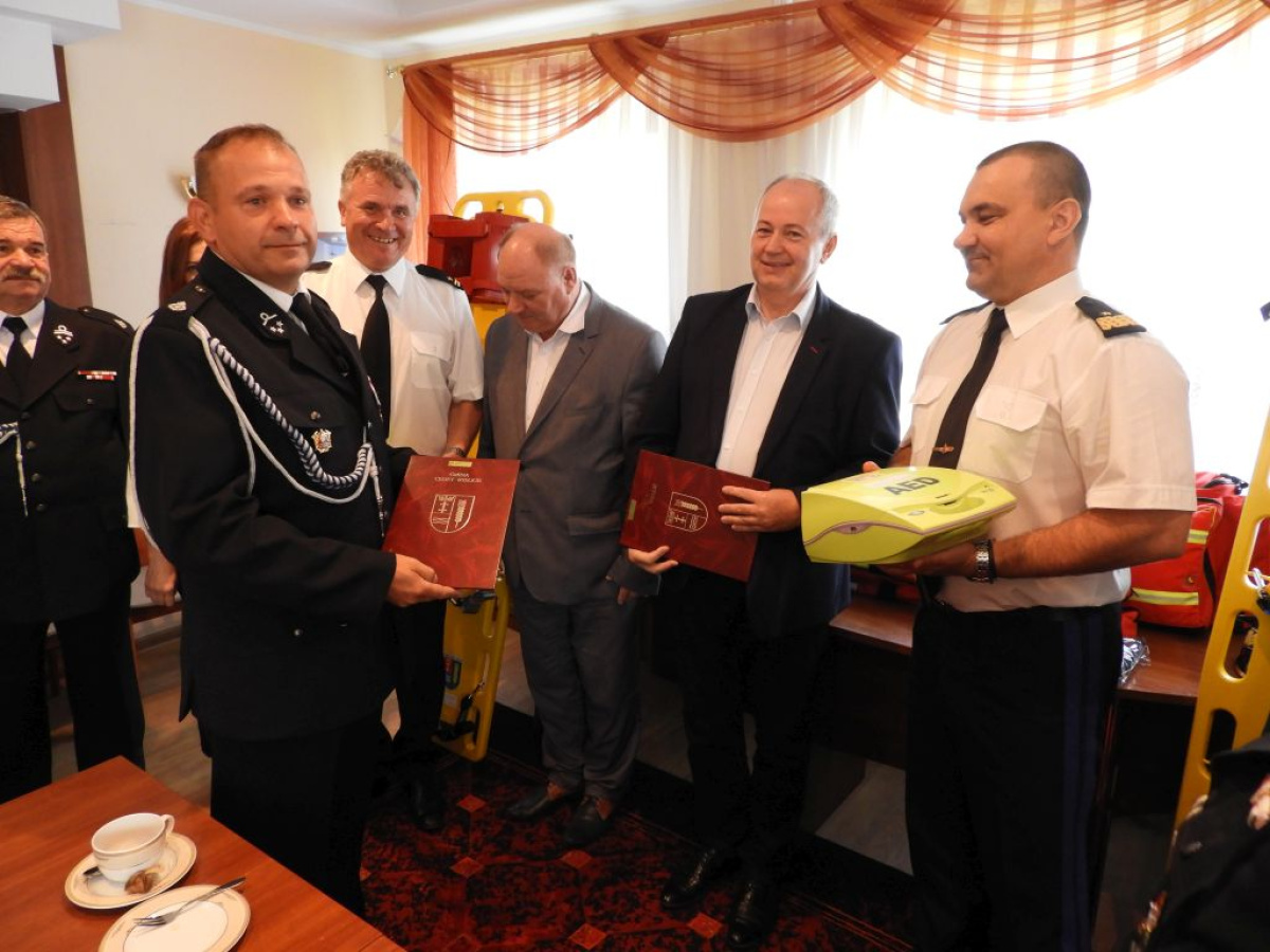 Strażacy OSP Cedry Wielkie już wiosną tego roku wraz z pracownikami Urzędu Gminy odbyli ćwiczenia z zakresu udzielania pierwszej pomocy z użyciem właśnie takiego defibrylatora w wersji treningowej. Wszyscy strażacy posiadający szkolenie Kwalifikowanej Pierwszej Pomocy odbędą również w niedługim czasie dodatkowe zajęcia w zakresie użytkowania defibrylatorów i ich obsługi technicznej. Mamy nadzieję, że nie są to ostatnie defibrylatory w naszej Gminie- planuje się projekty szkoleniowe mające na celu rozpowszechnienie dostępności tych urządzeń na terenie Gminy Cedry Wielkie. Po zakończeniu spotkania Pomorski Komendant Wojewódzki PSP wraz z Komendantem Powiatowym PSP i Wójtem Gminy odwiedził remizę OSP w Cedrach Wielkich, gdzie spotkał się ze strażakami i członkami młodzieżowej drużyny pożarniczej.