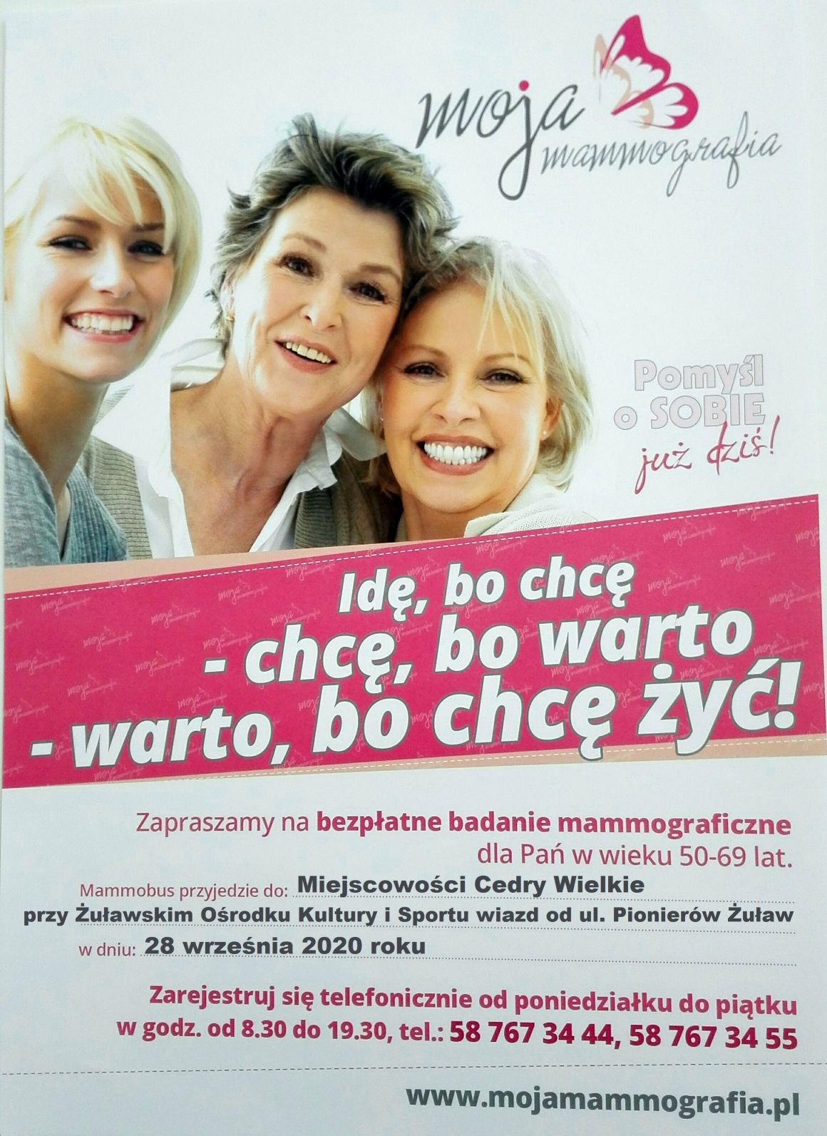 Zapraszamy na bezpłatne badania mammograficzne dla Pań w wieku 50-69 lat. Mammobus zlokalizowany będzie przy Żuławskim Ośrodku Kultury i Sportu w dniu 28 września (poniedziałek) 2020 r. Zarejestruj się telefonicznie od poniedziałku do piątku w godz. od 8.30 do 19.30 - tel. 58 767-34-44, 58 767-34-55.