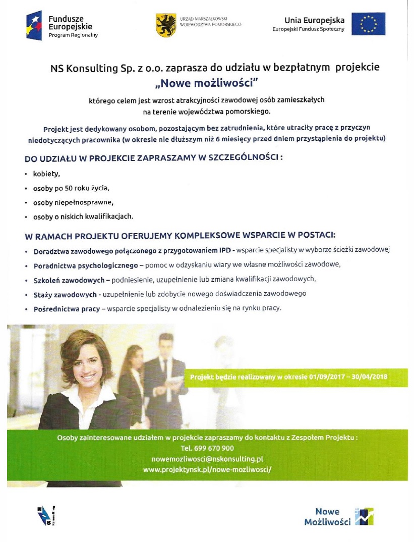 NS Konsulting Sp. z o.o. zaprasza do udziału w bezpłatnym projekcie "Nowe Możliwości", którego celem jest wzrost atrakcyjności zawodowej osób zamieszkałych na terenie woj. pomorskiego. Szczegółowe informacje na temat projektu zawarte są na poniższym plakacie.
