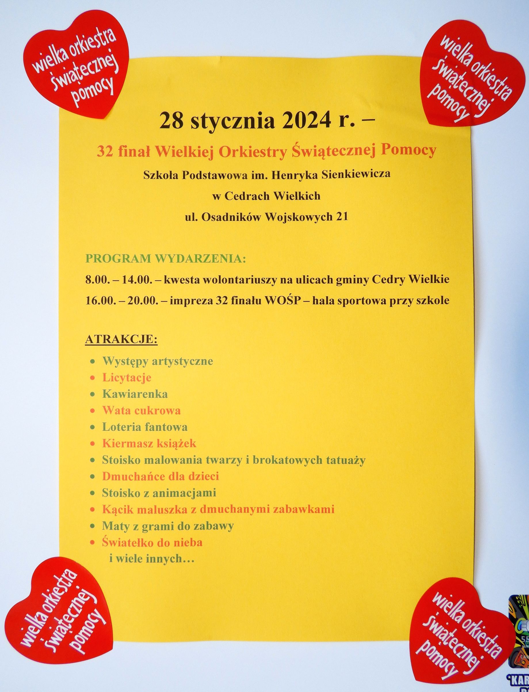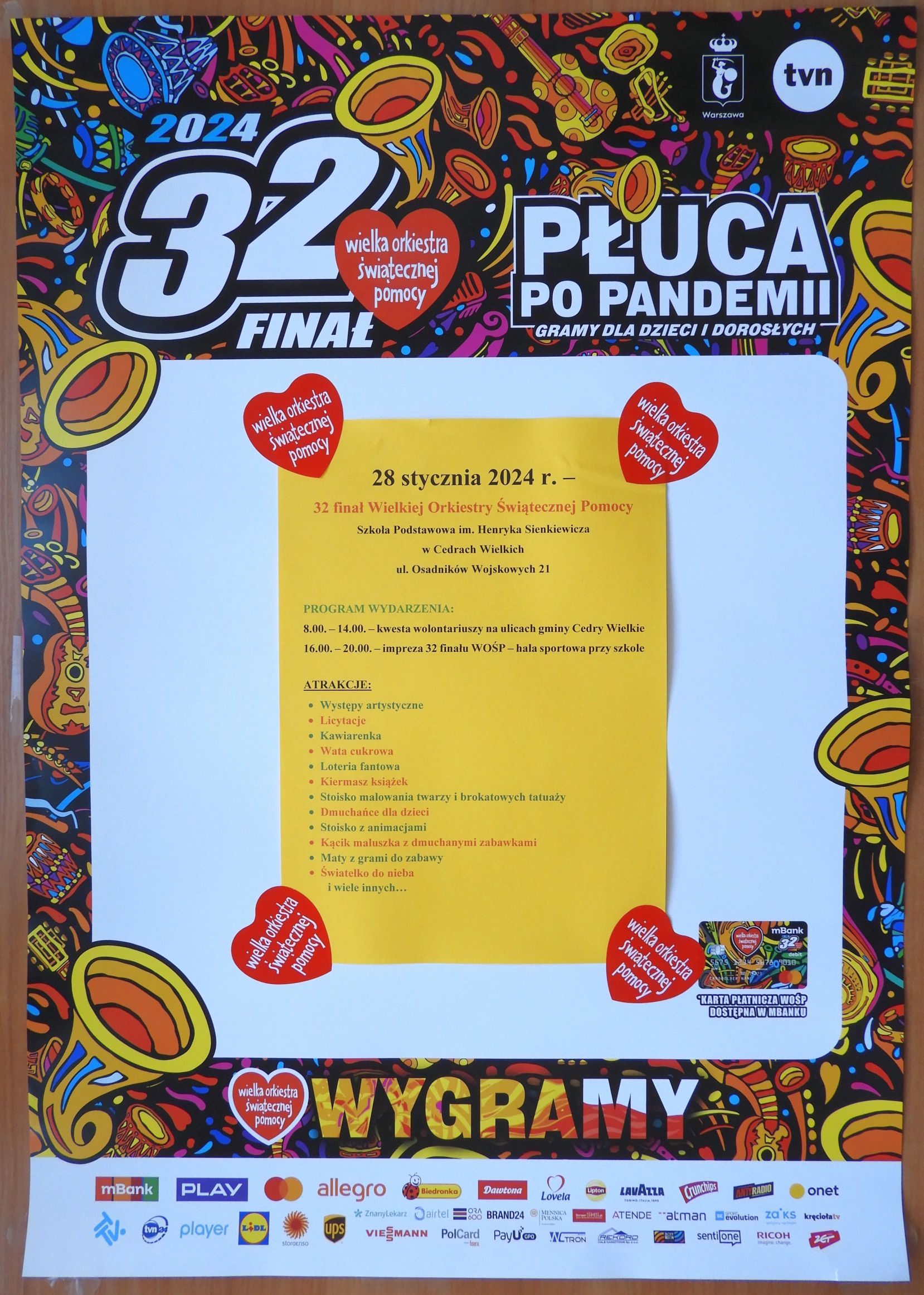 Serdecznie zapraszamy na 32 FINAŁ WIELKIEJ ORKIESTRY ŚWIĄTECZNEJ POMOCY, który odbędzie się w dniu 28 stycznia 2024 roku (niedziela) od godziny 16.00 do 20.00 w hali sportowej przy Szkole Podstawowej w Cedrach Wielkich, ul. Osadników Wojskowych 21.