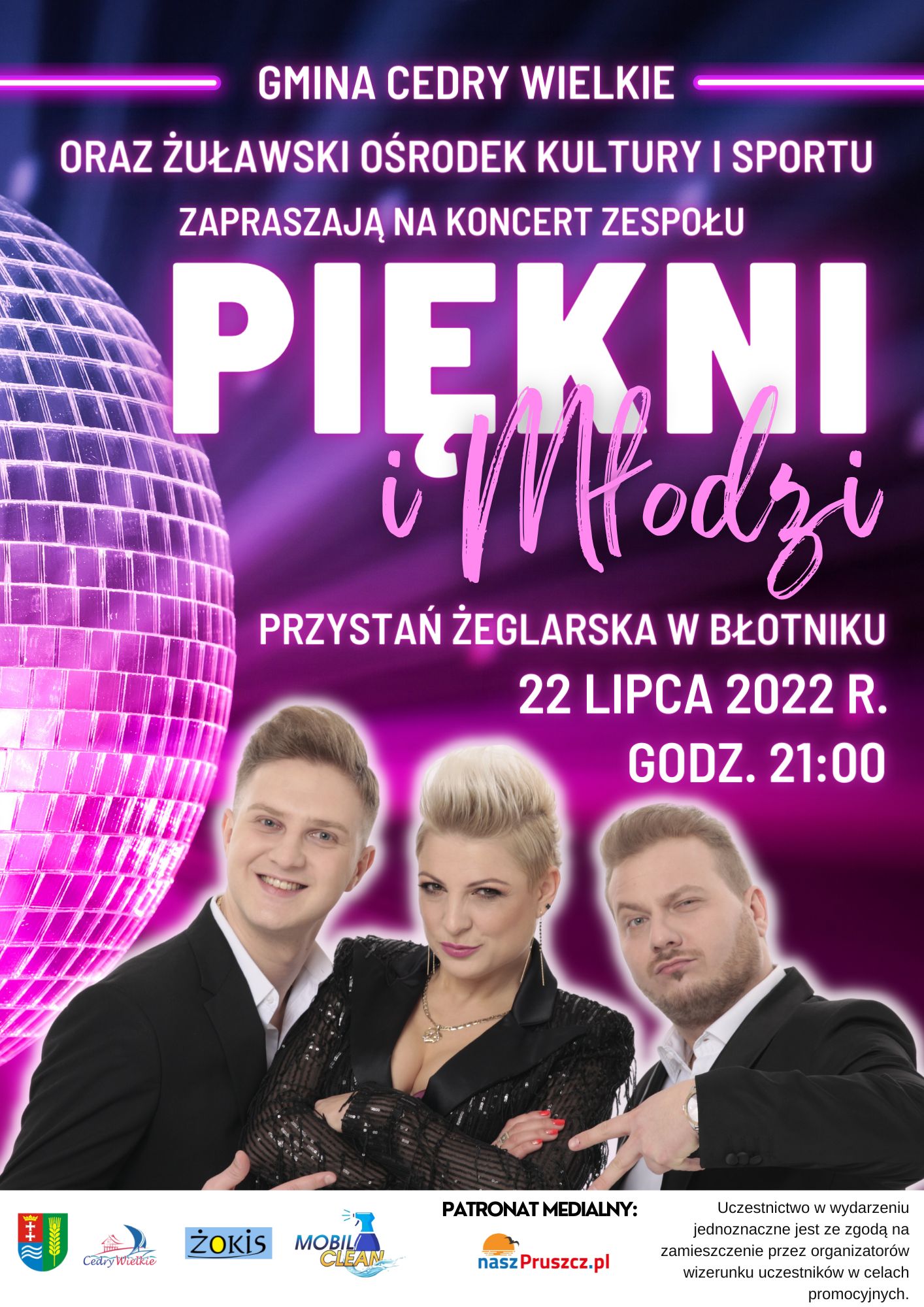 Gmina Cedry Wielkie oraz Żuławski Ośrodek Kultury i Sportu zapraszają na koncert zespołu „Piękni i Młodzi”, który odbędzie się na Przystani Żeglarskiej w Błotniku 22 lipca 2022 r. o godzinie 21:00.